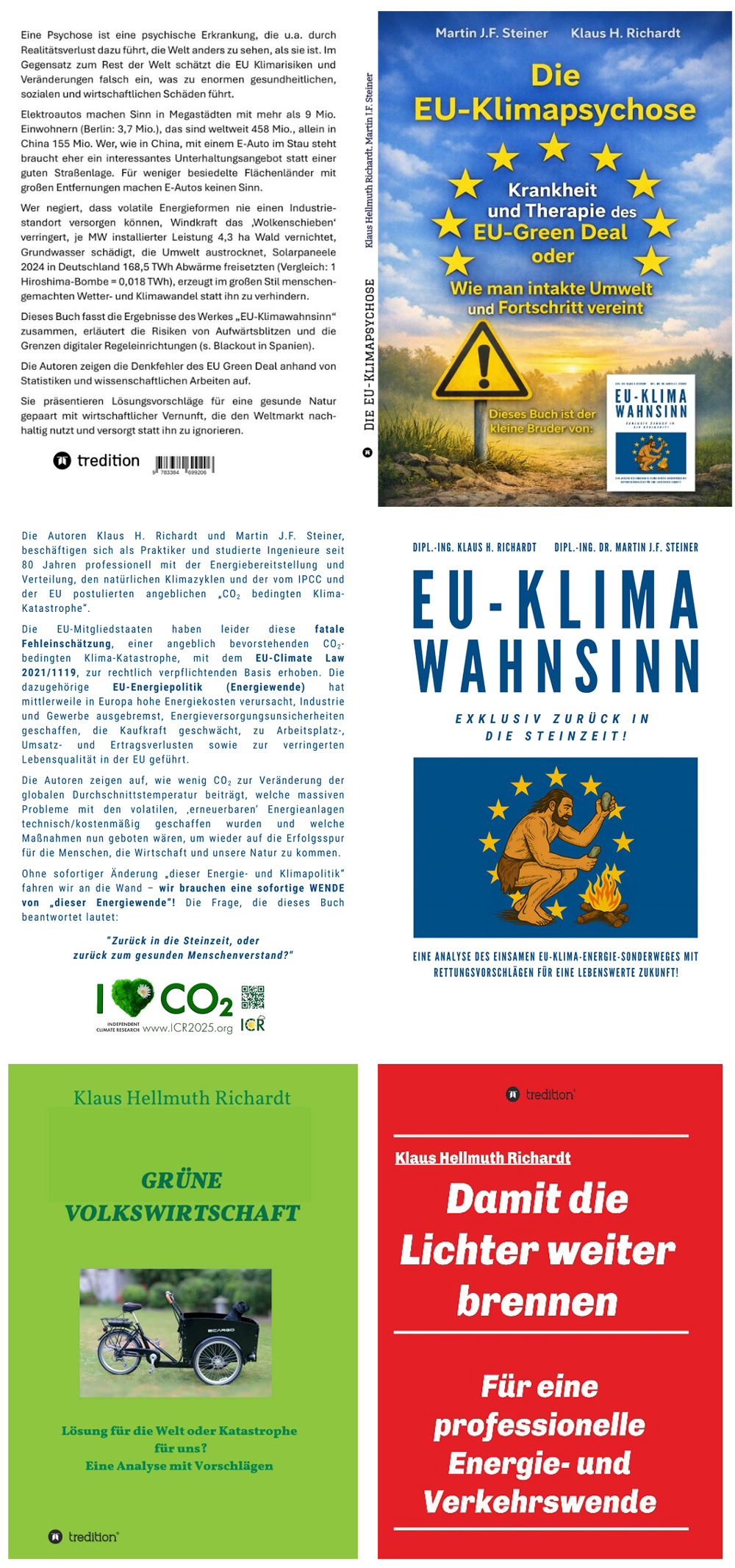 - „EU-Klimawahnsinn“ (2024): Eine Auseinandersetzung mit dem EU-Green Deal, dessen ökologischen, gesellschaftlichen und wirtschaftlichen Folgen. Er schlägt eine Wende von der Energiewende vor und zeigt auf, wie man schnellstmöglich auf die Erfolgsspur zurückfindet.